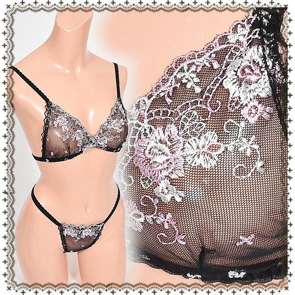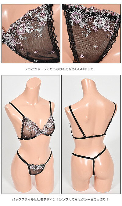 今なら ポイント5倍 ! 1000円ポッキリ メール便 送料無料ブラ ショーツ セット Tバック 「 淡いピンクのお花が可愛い ブラ ショーツ ブラセット 」 セクシー下着 フリーサイズ ノンワイヤーブラ オープン ブラック[[r-5532]]