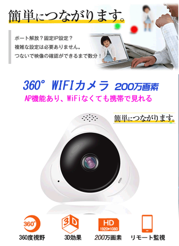 【レターパック送料無料】200万画素!Wifiネットワークカメラ/Wifiカメラ/ベビー・ペット・防犯監視カメラ!360度視野/ワイヤレスモニターカメラ/iPhone・AndroidスマホOKのWifiネットワークカメラ!microSDカード録画!動体検知!赤外線!家庭用/小型/屋内防犯 360