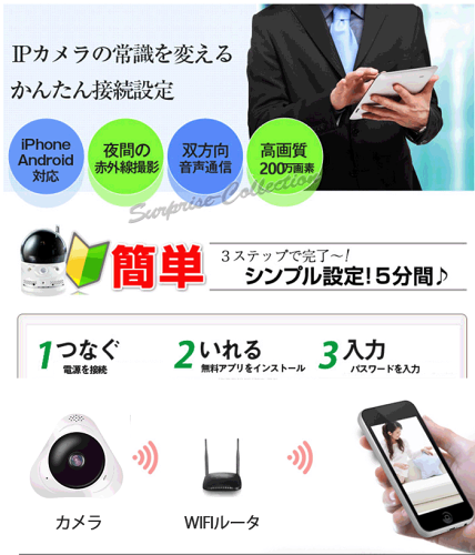 商品紹介 ◎ 機能:Wifiネットカメラ/200万画素/360度視野/双方向音声/64GB対応/動体検知/赤外線 ◎ microSDカード最大64GBまで対応 ◎ 動きを検知してプッシュ通知を送信可能です。