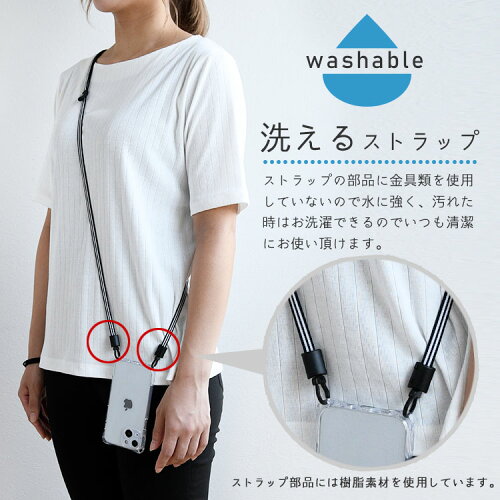 ストラップ紐はポリエステル100%、部材には金属ではなく樹脂素材を使用している為、水に強く汚れた場合にはお洗濯ができるので、いつでも清潔にお使いいただけます。
